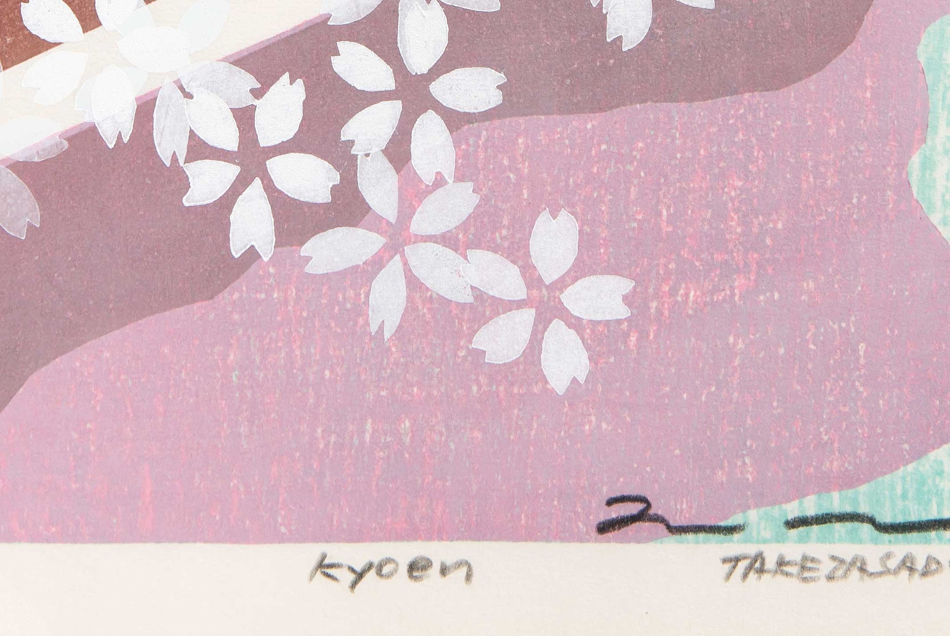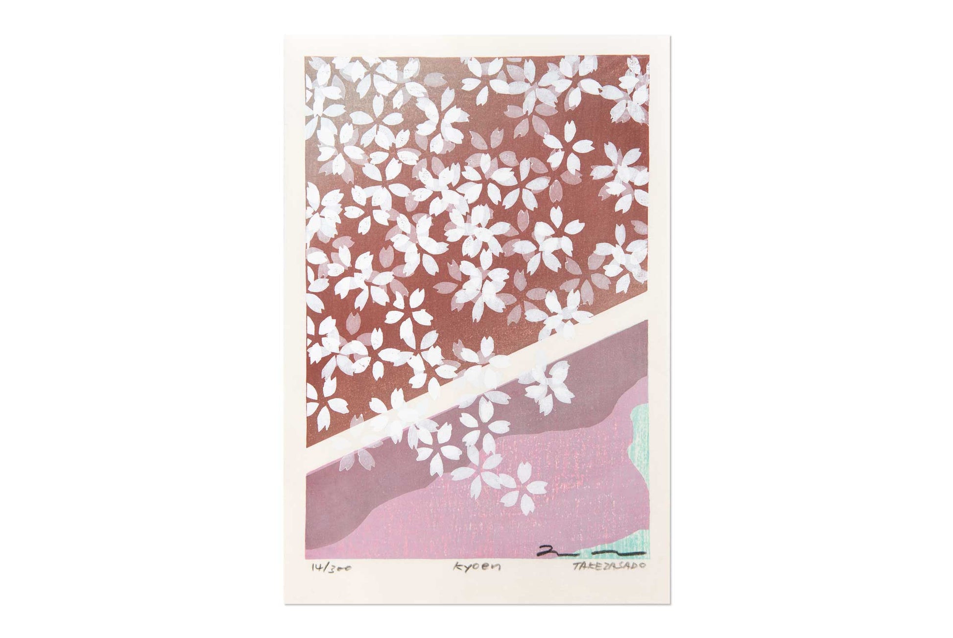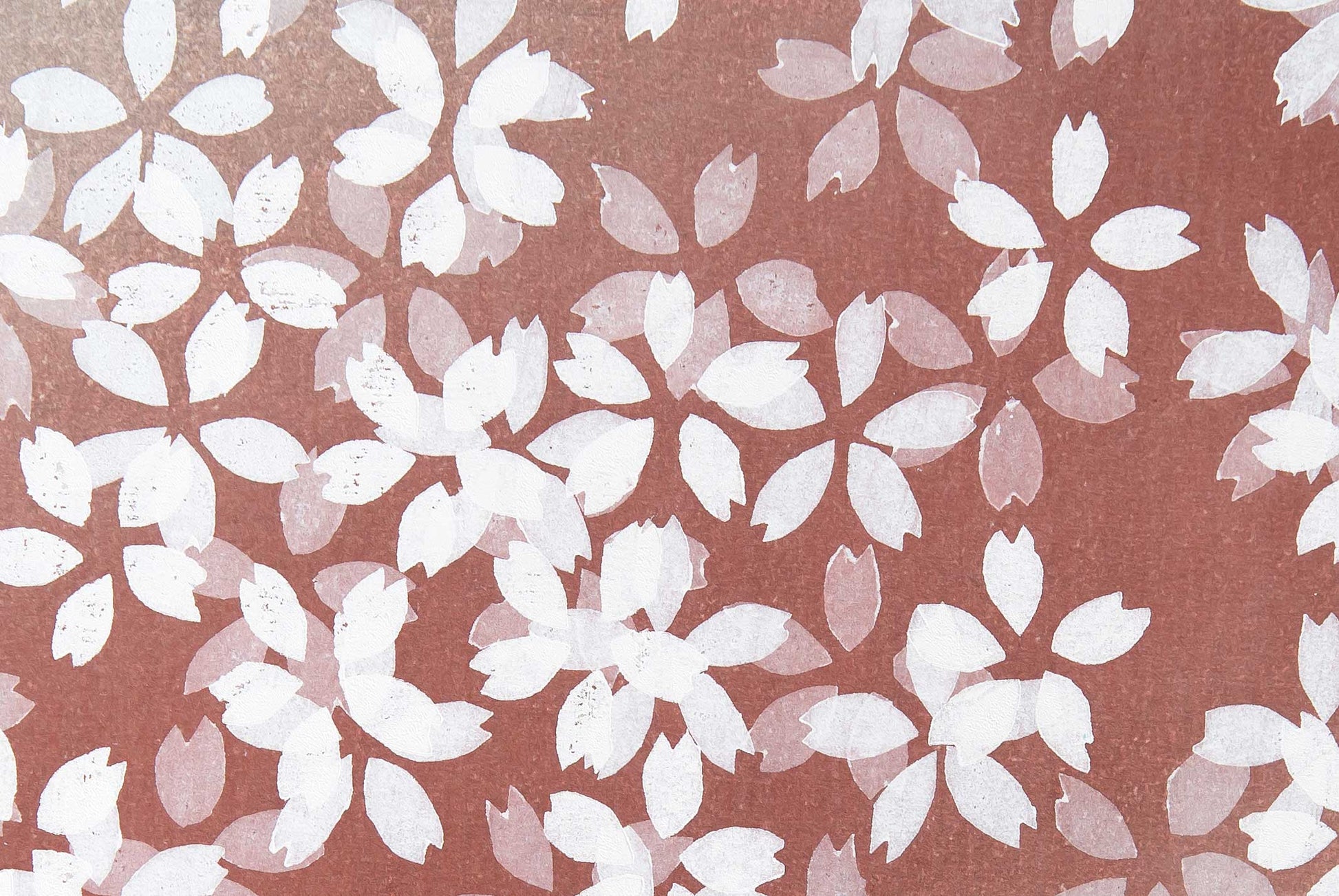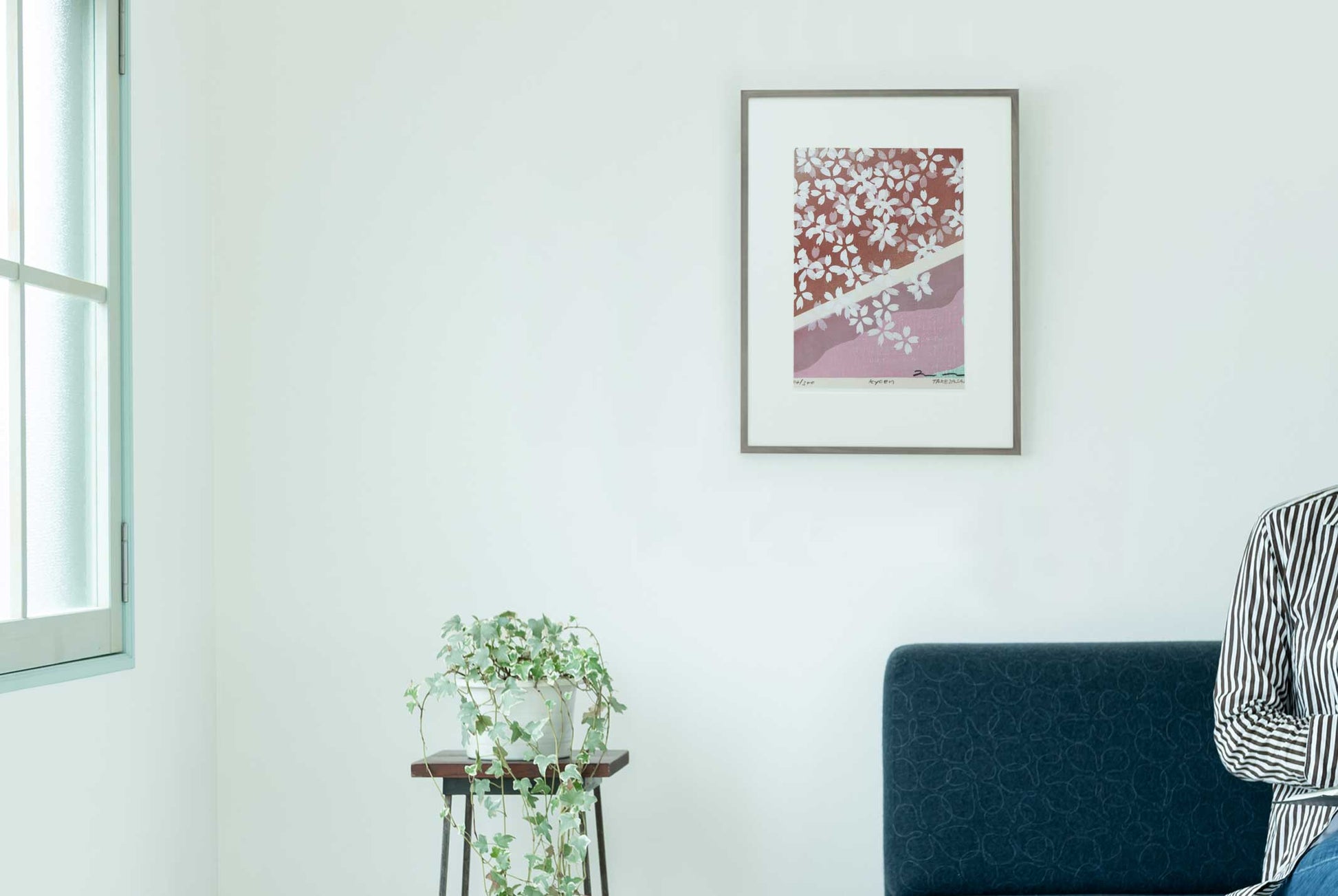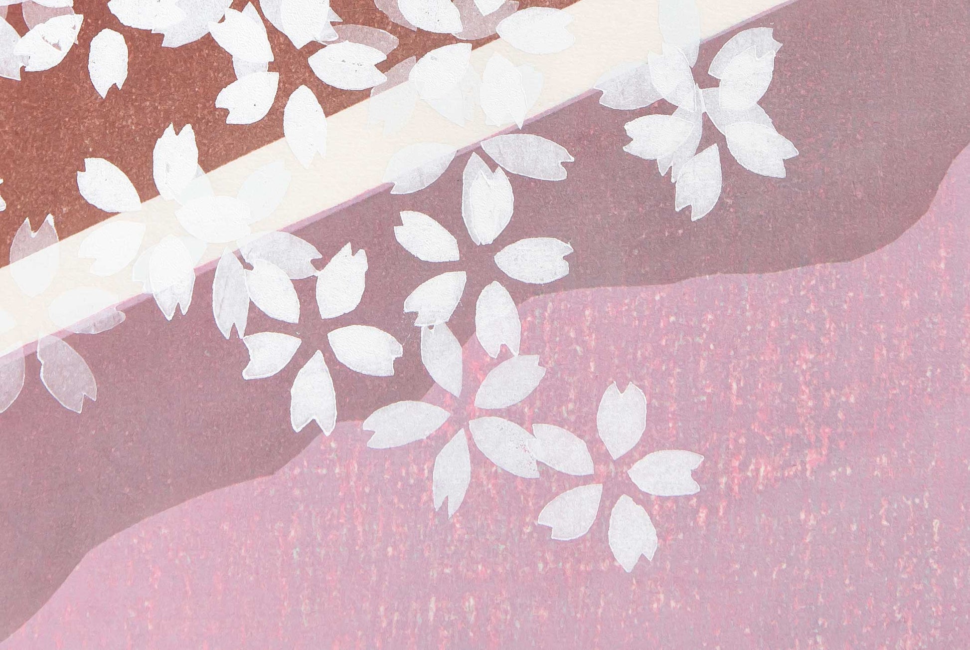 琵琶湖から流れる疏水べりの桜は有名で、桜の季節には十石舟が行き交い、深緑色をした疏水の水面に桜が投影されることで、緑色と桜色の見事な“協演”を望む。満開の桜を貝殻で作られた顔料「胡粉」で描き、幾重にも重ねることで美しく白い花びらが浮かびあがります。