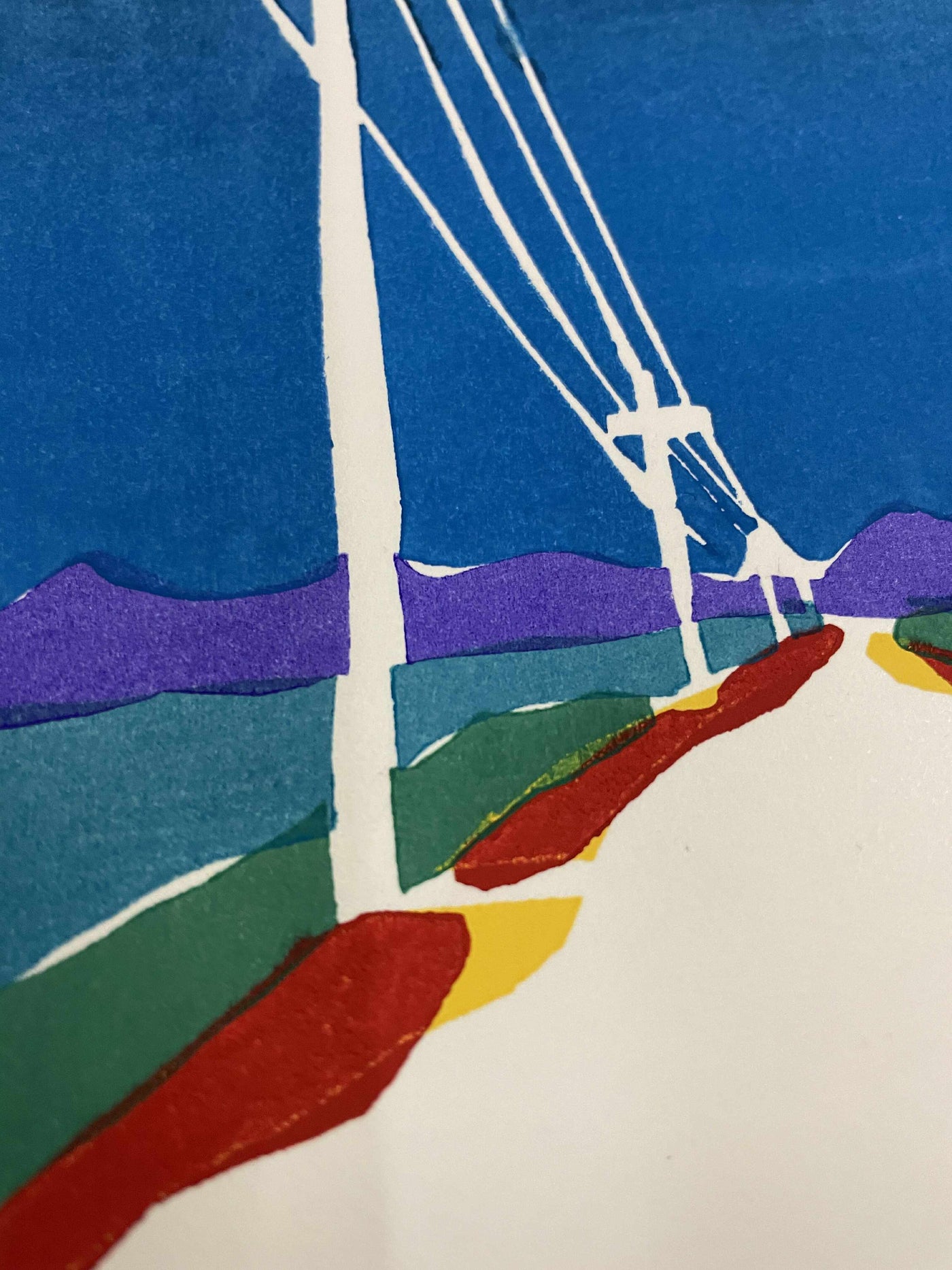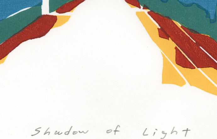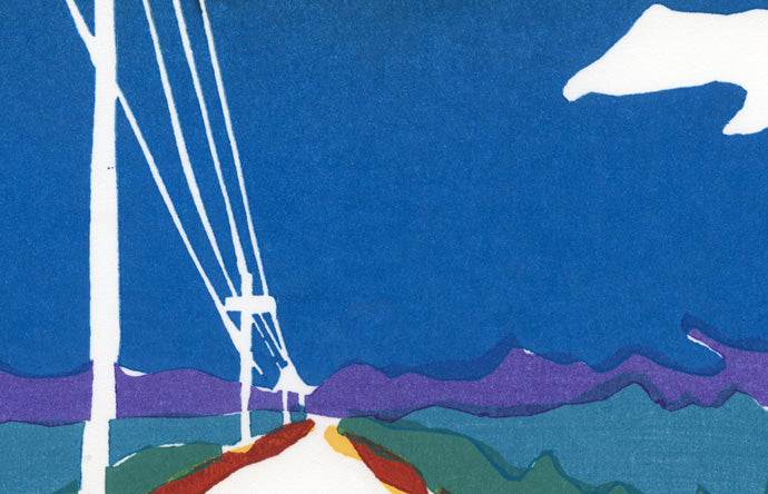 暑い夏の風景を表現した木版画作品。誰もいない道にまっすぐ伸びる電線は、強い陽射しの中で静かに存在感を放ちます。光は地面に深い影を落とし、熱を帯びた空気とともに鮮やかな色彩を浮かび上がらせます。刻々と変化する夏の光と影を意識しながら、「その瞬間だけの時間」を版木に残すように摺り重ねました。記憶と感覚をもとに、「確かに流れる時間」を描いた一枚です。