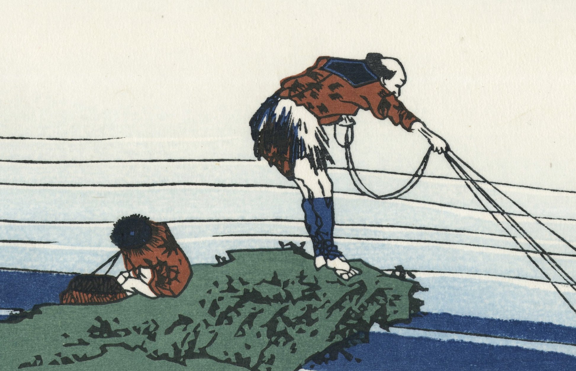 A fisherman casts his net beside a child on the rocky banks of the Fuji River. The force of the rushing water contrasts with the calm silhouette of Mount Fuji in the distance, capturing both the power of nature and the quiet persistence of human life. With its dynamic composition and graceful lines, this print is one of the most evocative works in Hokusai’s Thirty-six Views of Mount Fuji series.